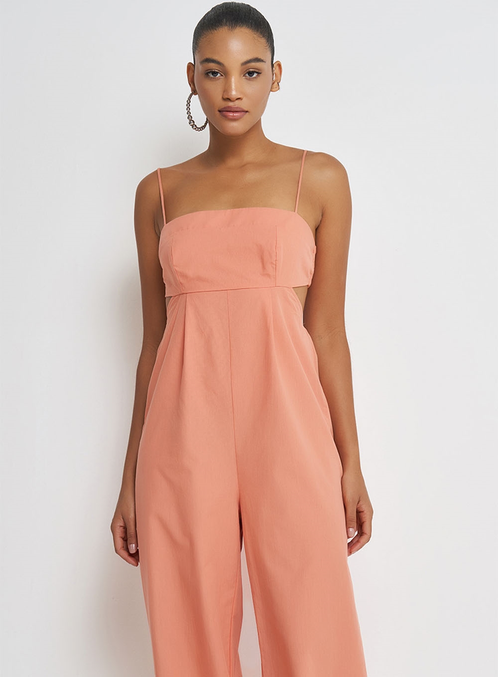 Macacão longo em viscose laranja, elástico na nas costas, decote frente e costas reto, alças com regulagem, fechamento em ziper na lateral.