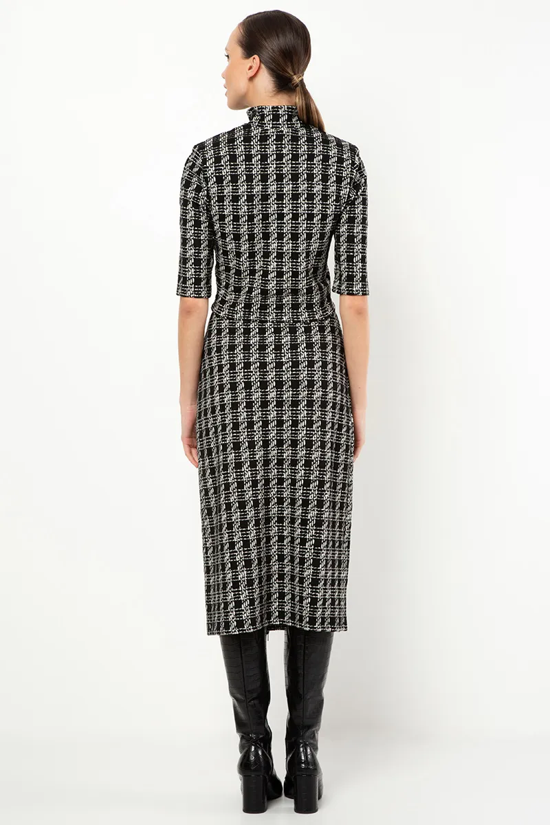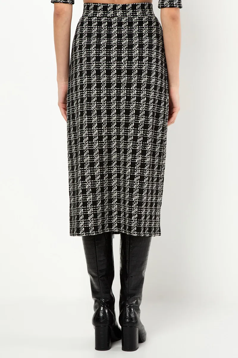 Saia Mídi Justa Malha Jacquard Padronagem Xadrez