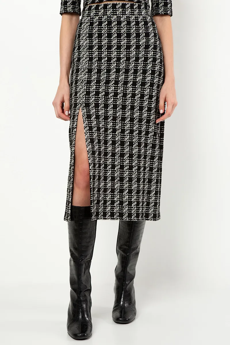 Saia mídi justa com fenda frontal no meio da coxa, cós com elástico encapado, em malha jacquard estruturada com padronagem xadrez preto e branco. Essa peça traz sensualidade na medida certa, sem perder a elegância e o conforto. Sua versatilidade vai dos looks mais ousados até produções mais descontraídas e joviais. Sugestão de uso com cropped.