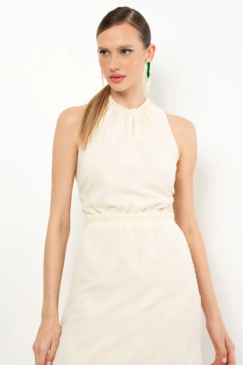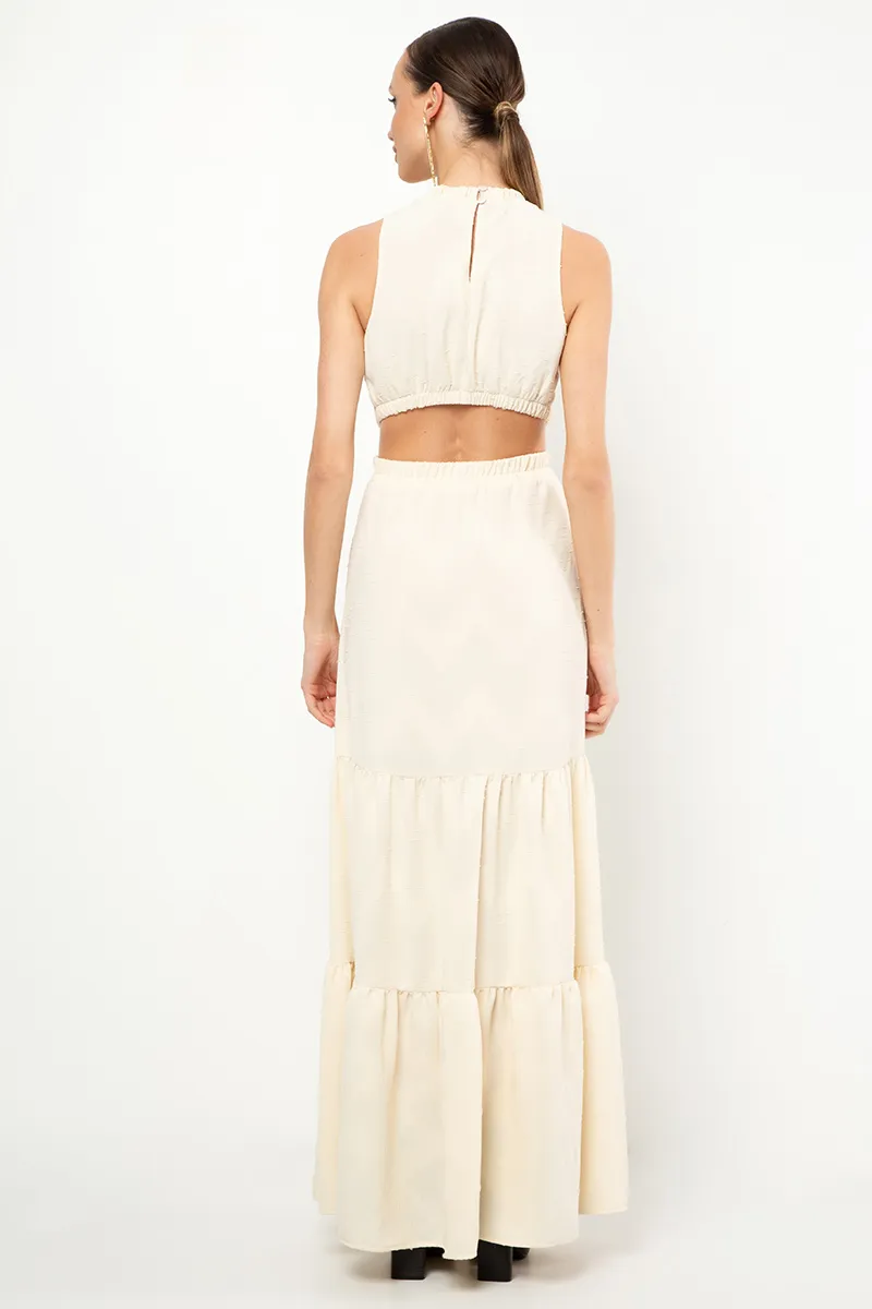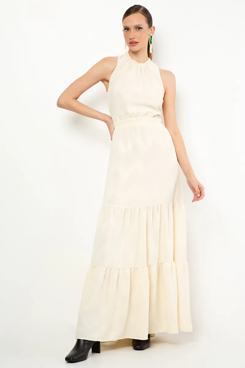 Vestido maxi com elástico no decote ficando ajustado ao pescoço e franzido, com cava americana regata, cintura com elástico, babados franzidos, costas com abertura em formato de gota e fechamento por botões de pé e elástico super fino e recorte deixando a pele amostra, peça forrada em malha crepe. Corpo em crepe maquinetado levemente acetinado com padronagem super sutil no próprio tecido em zigue zague. Um sonho de vestido, o modelo é lindo e acrescenta um toque romântico ao seu visual. Você pode usá-lo em vários momentos, combinando com acessórios diferentes.