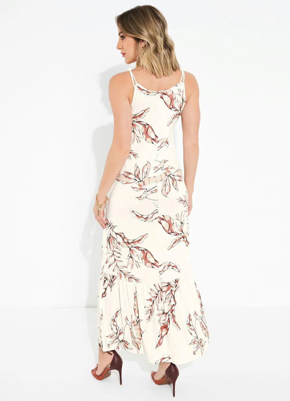 Vestido máxi de alça, decote V, recortes franzidos, fechamento em zíper nas costas, alças com regulador de altura, alça transpassada nas costas. Com um estilo romântico perfeito para momentos casuais, será a sua aposta certa! Combinando charme e conforto em uma peça única, garantindo que você se destaque em qualquer ocasião especial. Combine com uma sandália e arrase! Este vestido é uma peça curinga e prática. Ótimo aliado para todos os momentos.